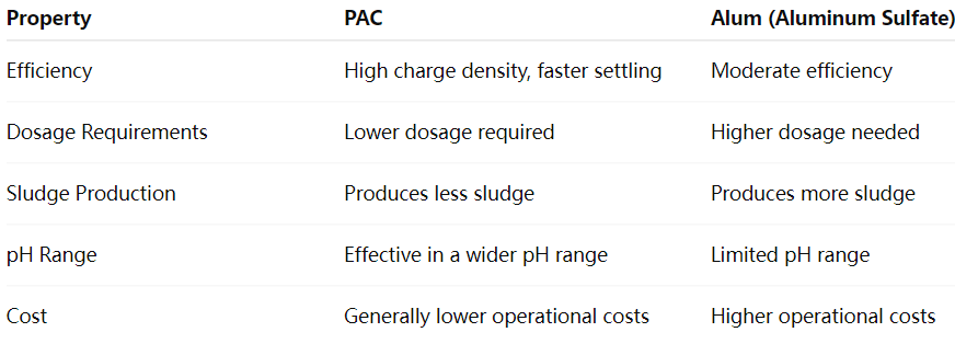 Za razliku od tradicionalnih koagulanata poput aluma (aluminij sulfat), PAC je poznat po svojoj vrhunskoj učinkovitosti i bržem vremenu taloženja u procesima obrade vode. Ima visoku gustoću naboja, što ga čini posebno učinkovitim u destabilizaciji suspendiranih čestica i formiranju većih floka, koji se zatim mogu ukloniti sedimentacijom ili filtracijom.